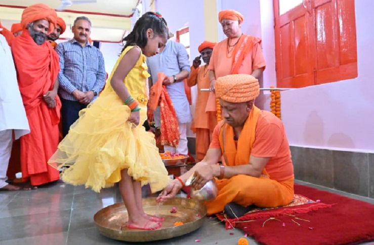मुख्यमंत्री योगी आदित्यनाथ ने मंदिर के अन्न क्षेत्र में नौ नन्हीं बालिकाओं के पांव धोकर पूजन किया. दुर्गा सप्तशती के मंत्रोच्चार के बीच उन्होंने माथे पर रोली, चंदन, दही और अक्षत से तिलक किया. पुष्प और दूर्वा से अभिषेक किया, माला पहनाई, चुनरी ओढ़ाई और उपहार व दक्षिणा देकर आशीर्वाद लिया. इस दौरान उन्होंने छह माह की बच्ची के भी पांव धोए और पूजन कर आशीर्वाद प्राप्त किया.