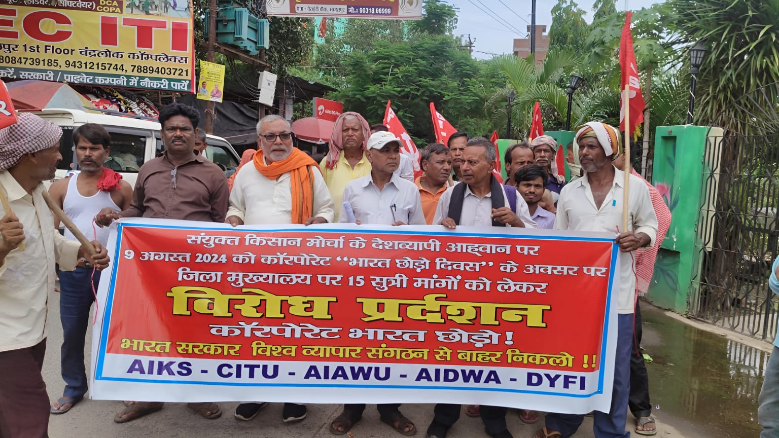 Bhagalpur News : भागलपुर में संयुक्त किसान मोर्चा के नेताओं ने कॉरपोरेट भारत छोड़ो का नारा लगाया. जिले के कटाव पीड़ितों के लिए अविलंब पुनर्वास व्यवस्था कराने, गंगा, कोसी के पानी का उपयोग नहर योजना के तहत महादेवपुर घाट से जाह्नवी चौक, बरारी घाट, बटेश्वर स्थल तक करने की मांग की गयी. कार्यक्रम का नेतृत्व संयुक्त किसान मोर्चा के तहत सीटू के दशरथ प्रसाद, एआइएडब्ल्यूयू के गणेश कुमार, डीवाईएफआइ के मनोज गुप्ता, एआइडीडब्ल्यूए सरिता सिंह, एआइकेएस के उपेंद्र यादव ने किया.माकपा ने की. नेताओं ने स्वामीनाथन आयोग की सिफारिश के अनुसार सभी फसलों की खरीद करने, किसानों व खेत मजदूरों का ऋण माफ करने, बिजली क्षेत्र का निजीकरण व स्मार्ट मीटर पर रोक लगाने आदि की मांग की गयी.