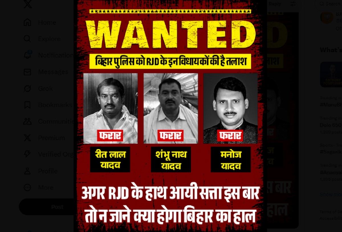बीजेपी ने अपने आधिकारिक X (पूर्व ट्विटर) हैंडल से ‘वांटेड पोस्टर’ शेयर करते हुए RJD के तीन विधायकों रीतलाल यादव, शंभू नाथ यादव और मनोज यादव को “फरार” बताया है. पोस्टर में लिखा है, “अगर RJD के हाथ आई सत्ता इस बार तो न जाने क्या होगा बिहार का हाल. भ्रष्टाचारियों को सत्ता में लाना है या बिहार को सुरक्षित बनाना है? फैसला आपका है, सोचिएगा ज़रूर.”