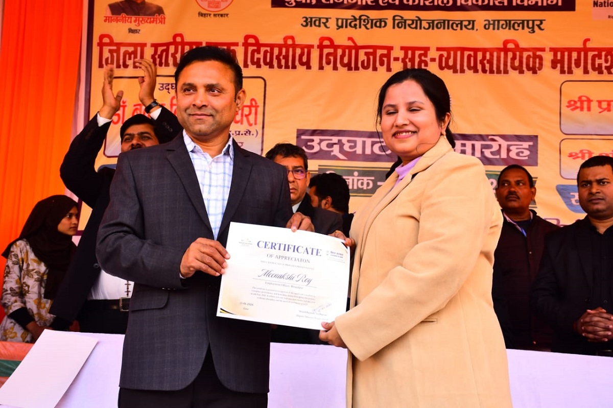 Employment Fair : भागलपुर, 15 जनवरी 2026 को राजकीय बालिका इंटर स्कूल परिसर में आयोजित जिला स्तरीय नियोजन सह व्यावसायिक मार्गदर्शन मेले का उद्घाटन जिलाधिकारी डॉ. नवल किशोर चौधरी ने किया. इस अवसर पर सहायक निदेशक (नियोजन), अवर प्रादेशिक नियोजनालय, भागलपुर की ओर से जिलाधिकारी को शॉल एवं स्मृति चिन्ह भेंट कर सम्मानित किया गया.