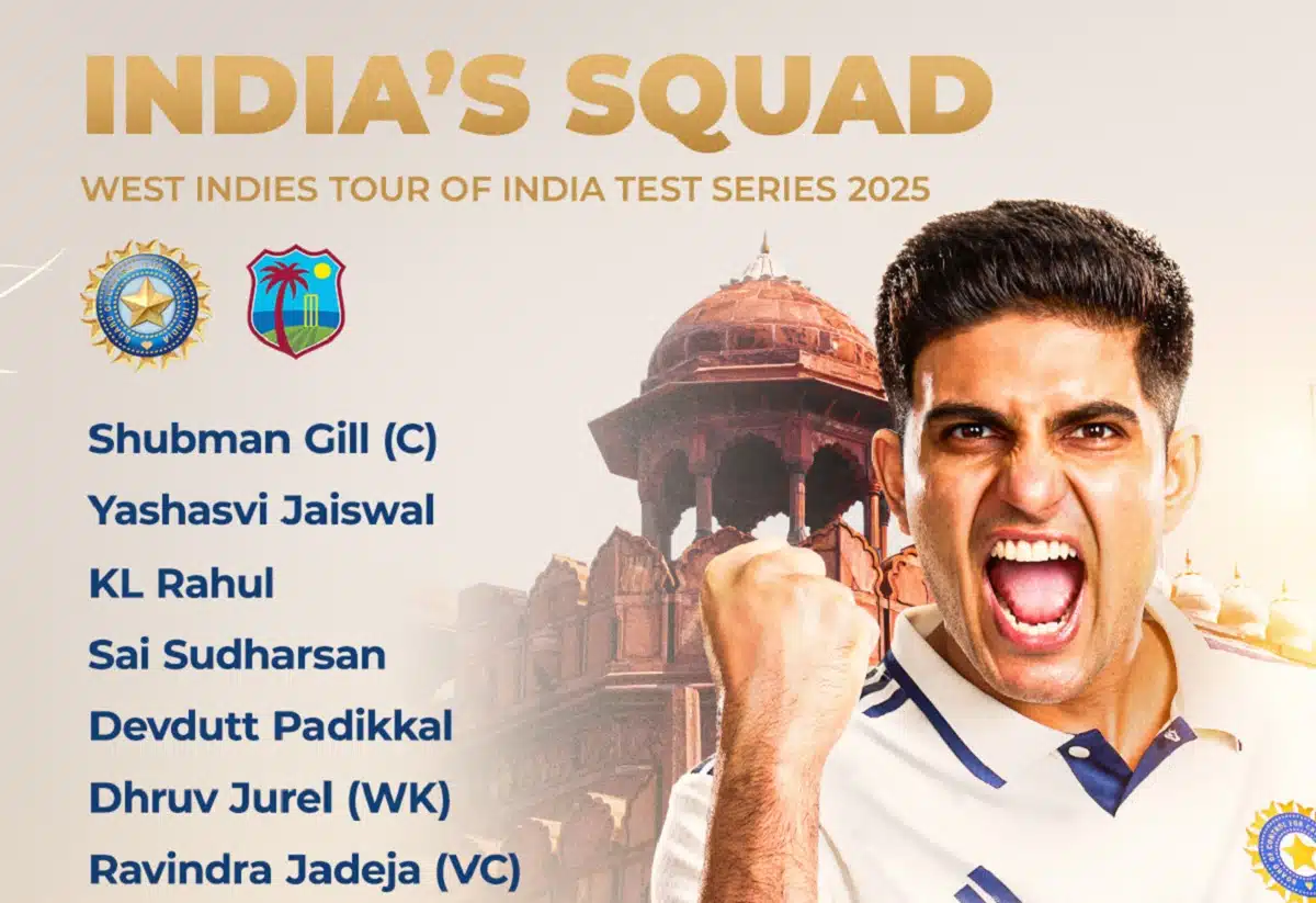 India vs West Indies Test Series 2025: भारत और वेस्टइंडीज के बीच होने वाली दो मैचों की टेस्ट सीरीज की शुरुआत 2 अक्टूबर से अहमदाबाद के नरेंद्र मोदी स्टेडियम में होगी. उससे पहले बीसीसीआई ने भारतीय टीम की घोषणा कर दी है. इस बार टीम का नेतृत्व युवा बल्लेबाज शुभमन गिल करेंगे, जो पहली बार घरेलू टेस्ट सीरीज में कप्तानी संभालेंगे. वहीं, विकेटकीपर बल्लेबाज ऋषभ पंत चोट के चलते उपलब्ध नहीं हैं, इसलिए उनकी जगह उपकप्तानी की जिम्मेदारी रवींद्र जडेजा को दी गई है.
