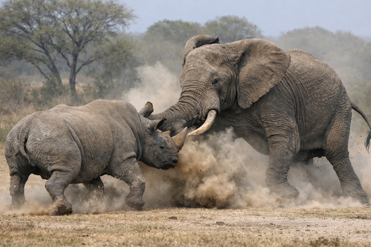 गैंडे की तेज रफ्तार को देखते ही हाथी तुरंत चौकन्ना हो जाता है. वह पीछे हटने के बजाय वहीं डटकर खड़ा रहता है. जैसे ही गैंडा करीब आता है, हाथी भी आगे बढ़कर उसे रोकने की कोशिश करता है.